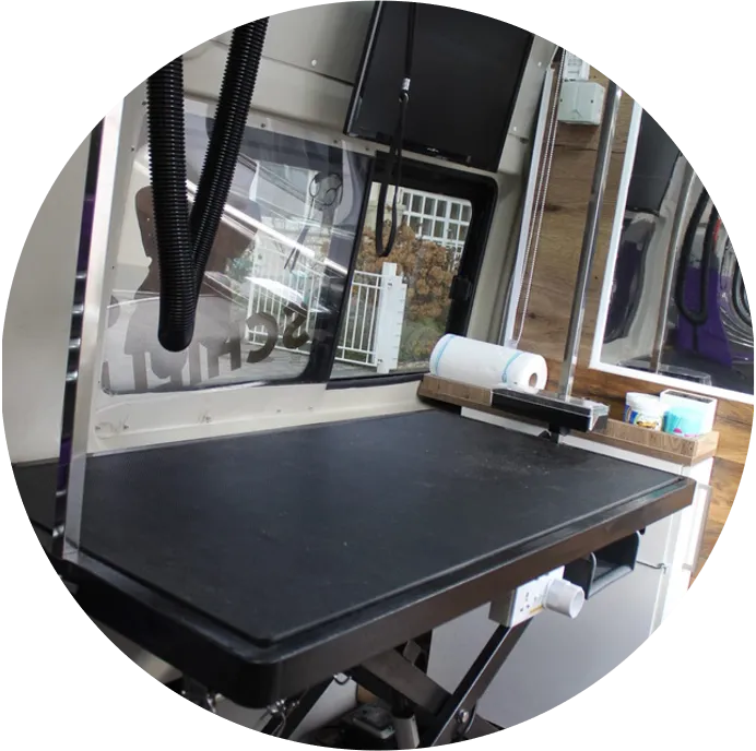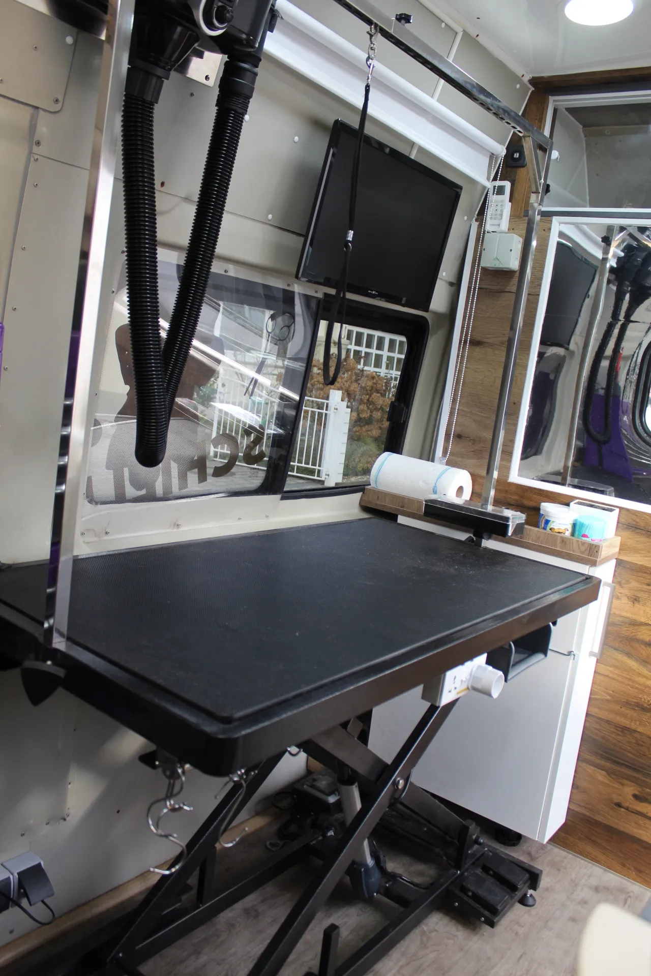 Professionelle Fellpflegedirekt vor der Haustür Deiner Kunden. Das Hundemobil ist ein vollausgestatteter Minivan mit allem, was Du als Groomer brauchst: Badewanne, Groomingtisch, Warmwasser, Föhn und durchdachtem Stauraum.
